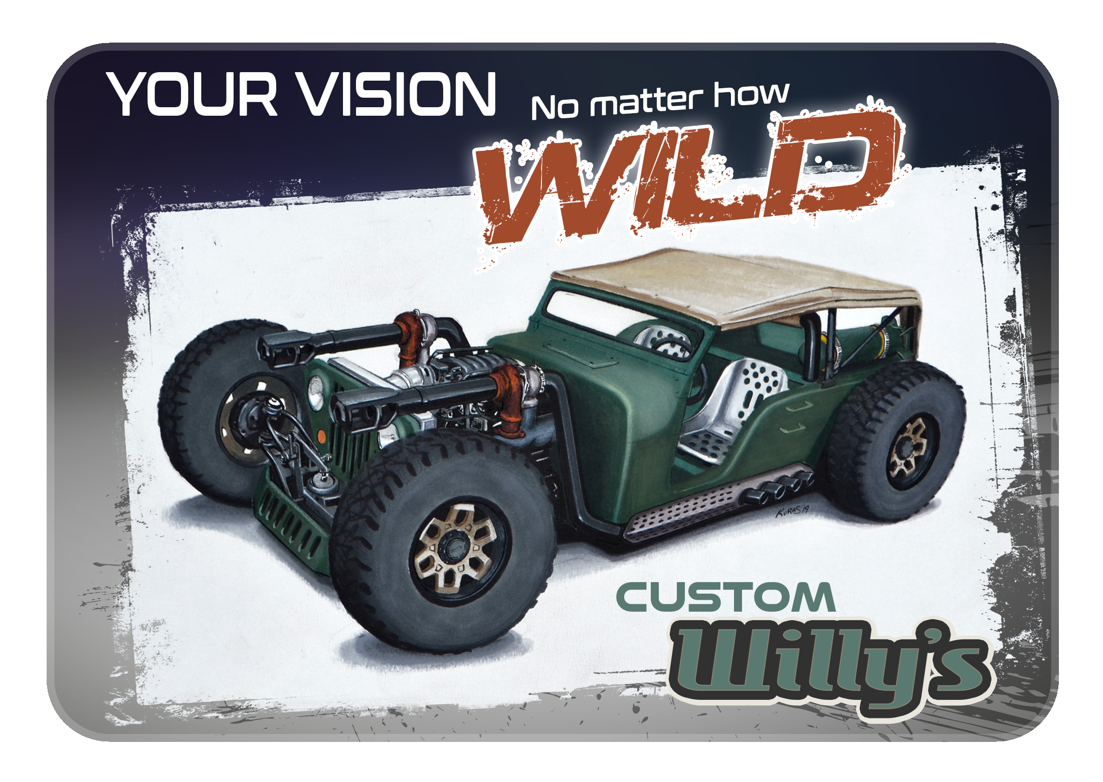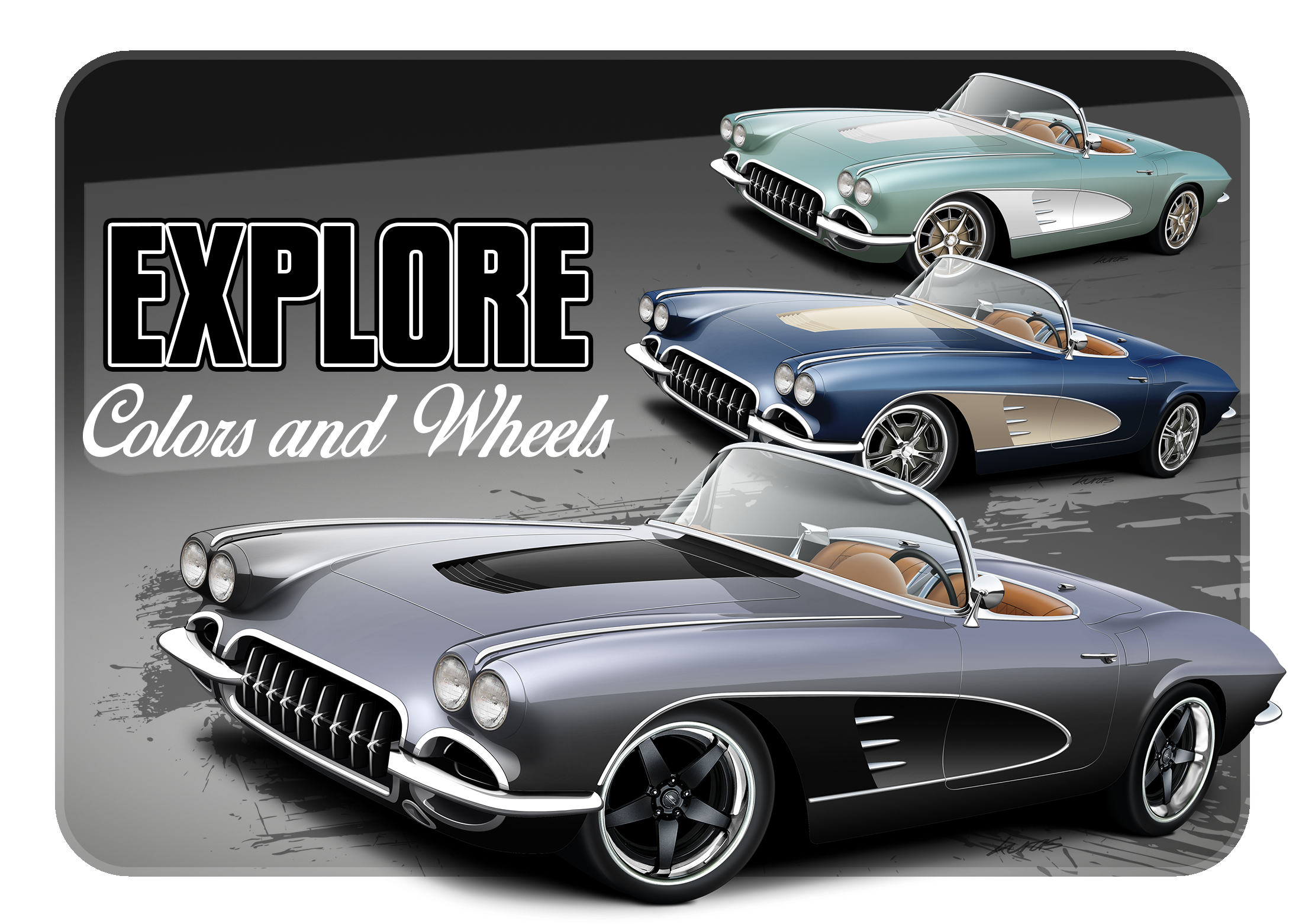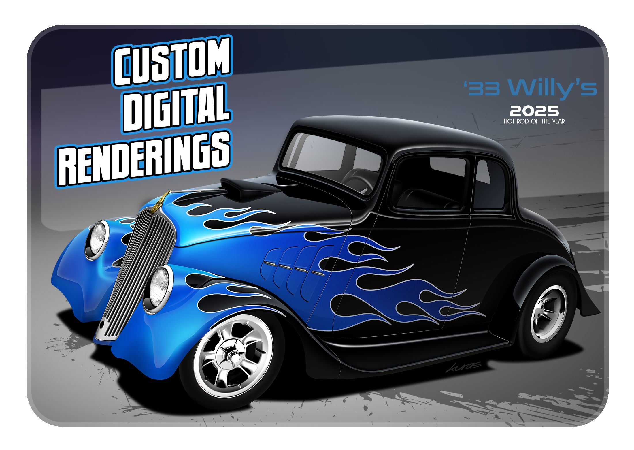 At Kuras Custom Renderings, you work with a professional car artist to see what your own hot rod design will look like. For SEMA builds, ISCA circuit cars, and other unique one-off builds, a hot rod illustration will save time, money, and a whole lot of headaches! With 20 years experience working in the automotive industry, I produce life-like, custom car renderings through sketching and rendering while adding digital flare. Looking for ways to promote your vehicle? I provide a host of other services for all of your automotive marketing needs including final renderings, T-shirt design, logo design, car show display boards, and brochure and card design.